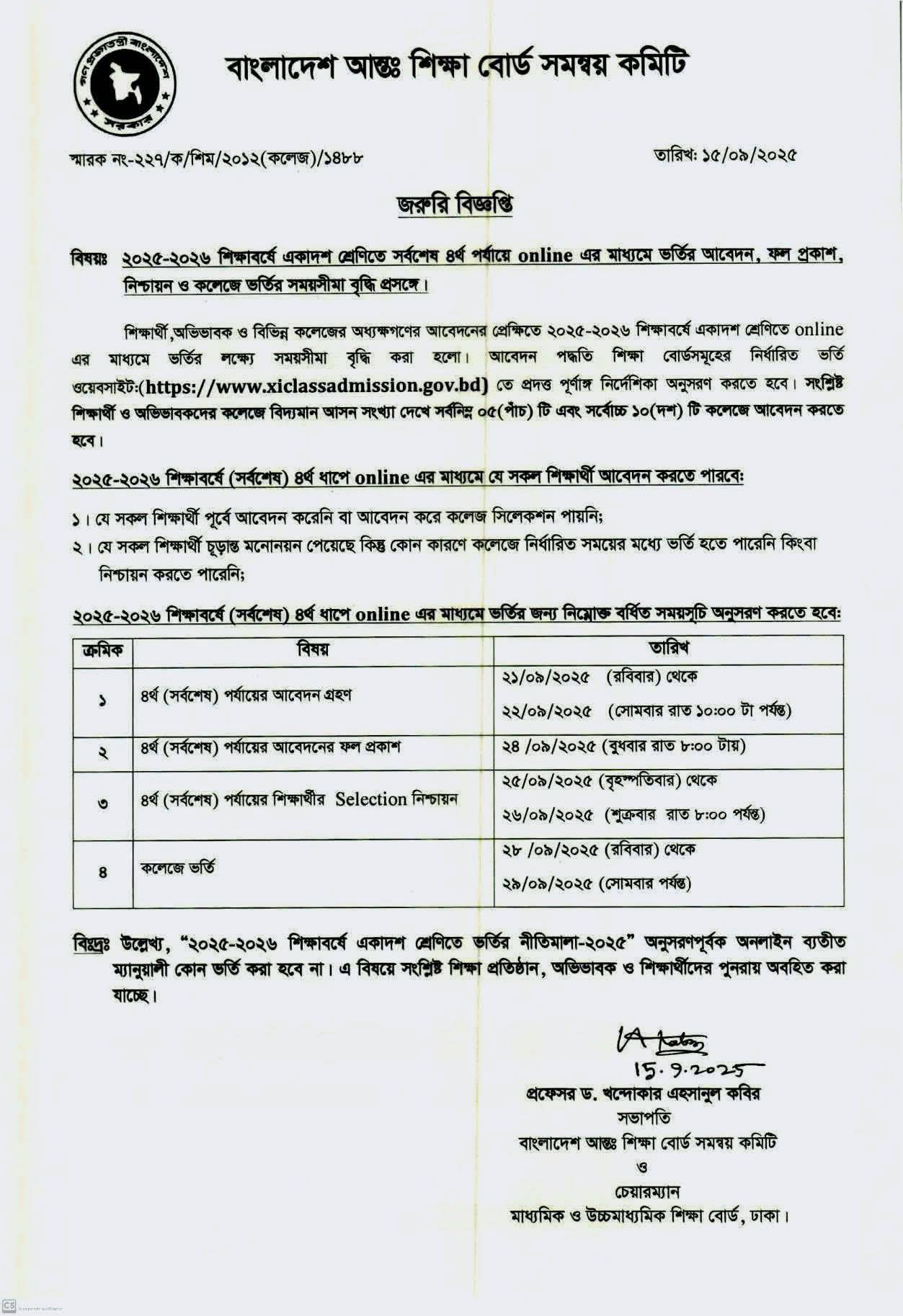 ২০২৫-২০২৬ শিক্ষাবর্ষে একাদশ শ্রেণিতে ভর্তির সময়সীমা বৃদ্ধি প্রসঙ্গে